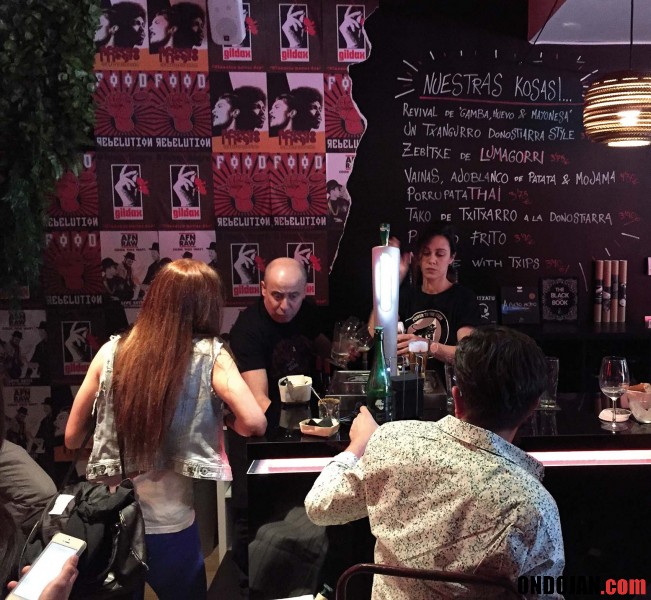 Encantados es decir poco para definir el estado de ánimo con el que ha vuelto el equipo de A Fuego Negro de Madrid, ciudad en la que durante todo un mes ha funcionado una réplica del bar donostiarra que recreaba su ambiente y su gastronomía. Ello ha sido posible gracias al novedoso restaurante pop-up The Table By, situado en el Urso Hotel & Spa, cuyo funcionamiento consiste en que diferentes restaurantes del estado tomen, literalmente, sus instalaciones para replicar en Madrid su oferta. Así, del 5 al 29 de marzo, The Table By sufrió una profunda transformación para funcinar igual que A Fuego Negro. Las paredes se pintaron de negro, se instalaron neones, se habilitó una zona de barra y otra de comedor emulando el bar original y se empapeló con los carteles que llenan las paredes en Donostia. El resultado, un clon de AFN que ha posibilitado a los madrileños el disfrutar de este original bar sin moverse de la villa y corte.
