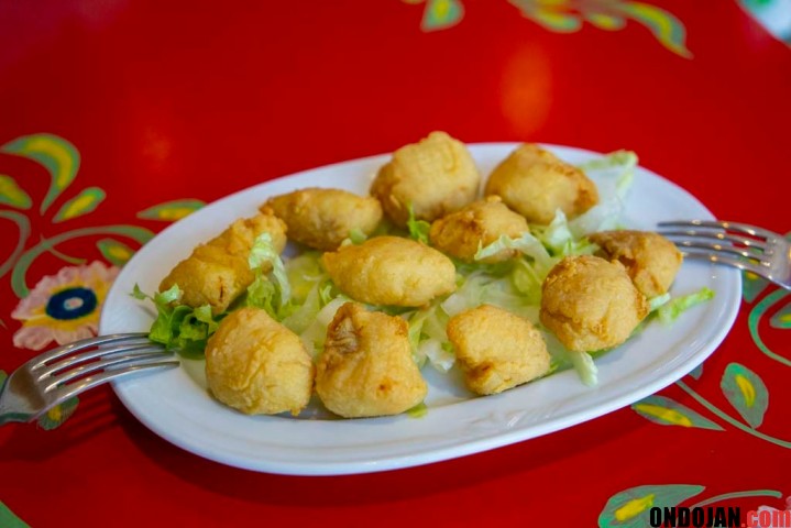 El pescado hizo su única pero estelar aparición en la forma del Cazón en adobo (Foto 6), otra exquisitez andalusí consistente en trozos irregulares de cazón, una especie de pequeño tiburón, que se adoba con vinagre, comino y pimentón y se fríe rebozado en harina de garbanzos que, según Mayca, “se adhiere muy bien al pescado”. Eso sí, según nos comenta Mayca, hay lugares en los que un plato de cazón o de chopitos termina dejando una montaña de rebozado suelto en el plato, cosa que no pasa con el de Arrikitaun. “El secreto consiste en secar bien el pescado”, nos comenta Mayca, “si se seca como es debido, no se cae el rebozado”. Además, en Arrikitaun usan para el rebozado harina de garbanzos, lo que aporta otro sabor y otra untuosidad a la fritura. “Hay quienes usan una proporción de 80-20 entre harina de garbanzos y normal. Nosotros lo hacemos al 100% con harina de garbanzo.