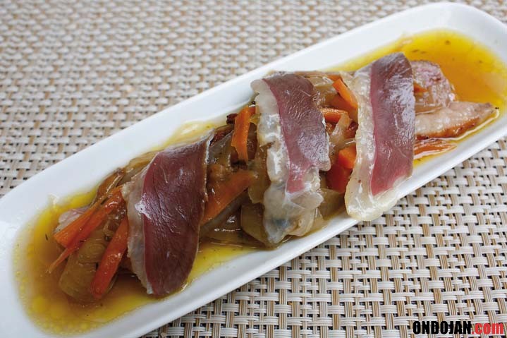 Pintxo dulzón a base de pato escabechado en un escabeche templado al que se añade foie, las verduras del propio escabeche y unas lonchas de jamón de pato ibérico..