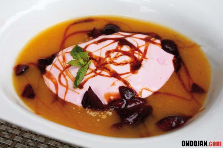 9.- SOPA DE MELOCOTON AL AROMA DE HIERBALUISA CON HELADO DE FRESA: