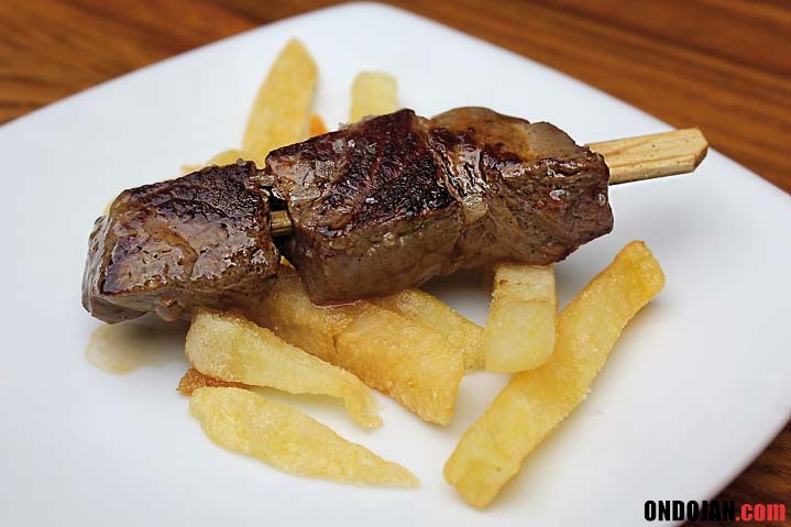 Algo tan sencillo como una brocheta con tres pedazos de carne, solo que en el caso que nos ocupa tanto la calidad de la misma como el punto de elaboración es perfecto.