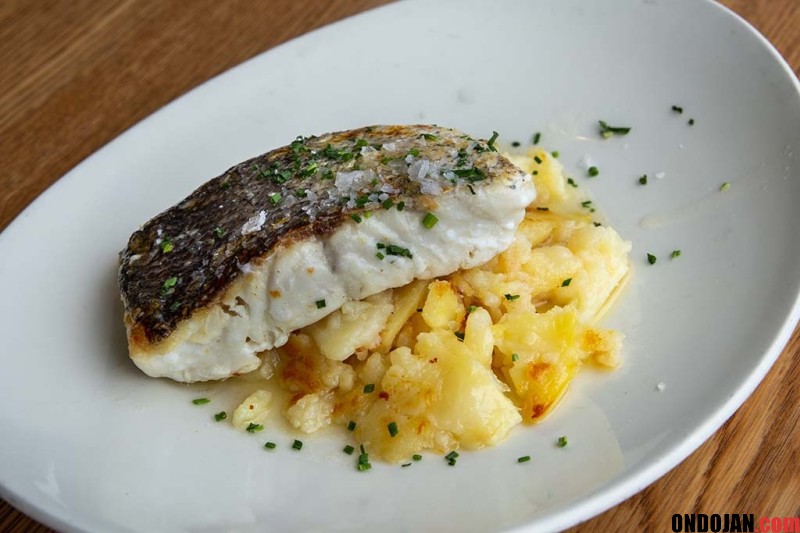 Disponemos en el plato una cama de cebolla y patata y sobe ella la merluza a la que añadimos un refrito templado de aceite de girasol (2 partes) vinagre (1 parte) y sal. Terminamos espolvoreando con sal maldon y cebollino fresco recién picado.