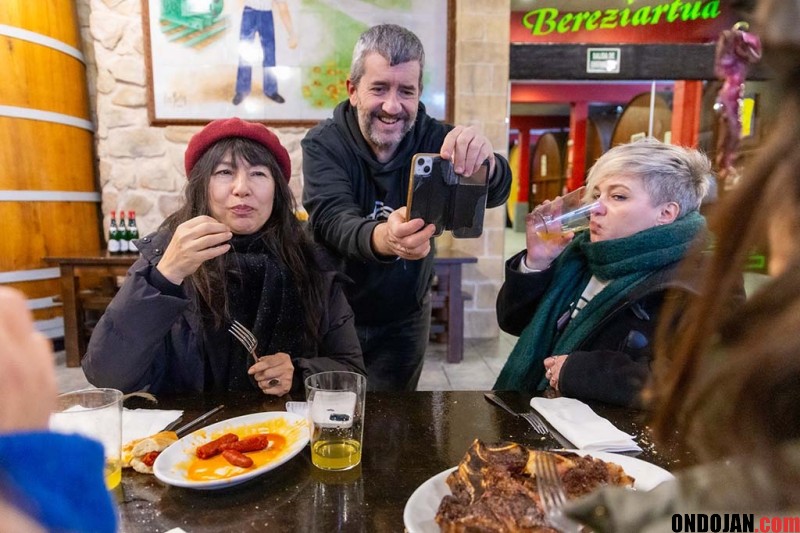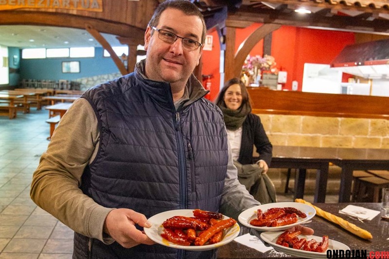 Aitor, igualmente, nos presentó las cuatro sidras que elaboran: Sidra “normal”, Sidra Denominación de Origen Euskal Sagardoa, Sidra ecológica y su cuidada Edición Gourmet. Asimismo, nos explicó las diferencias entre ellas y nos las dio a degustar, nos condujo por la zona de depósitos, tanto de madera como de aluminio, que esconde Bereziartua y, por supuesto, nos dio de comer.